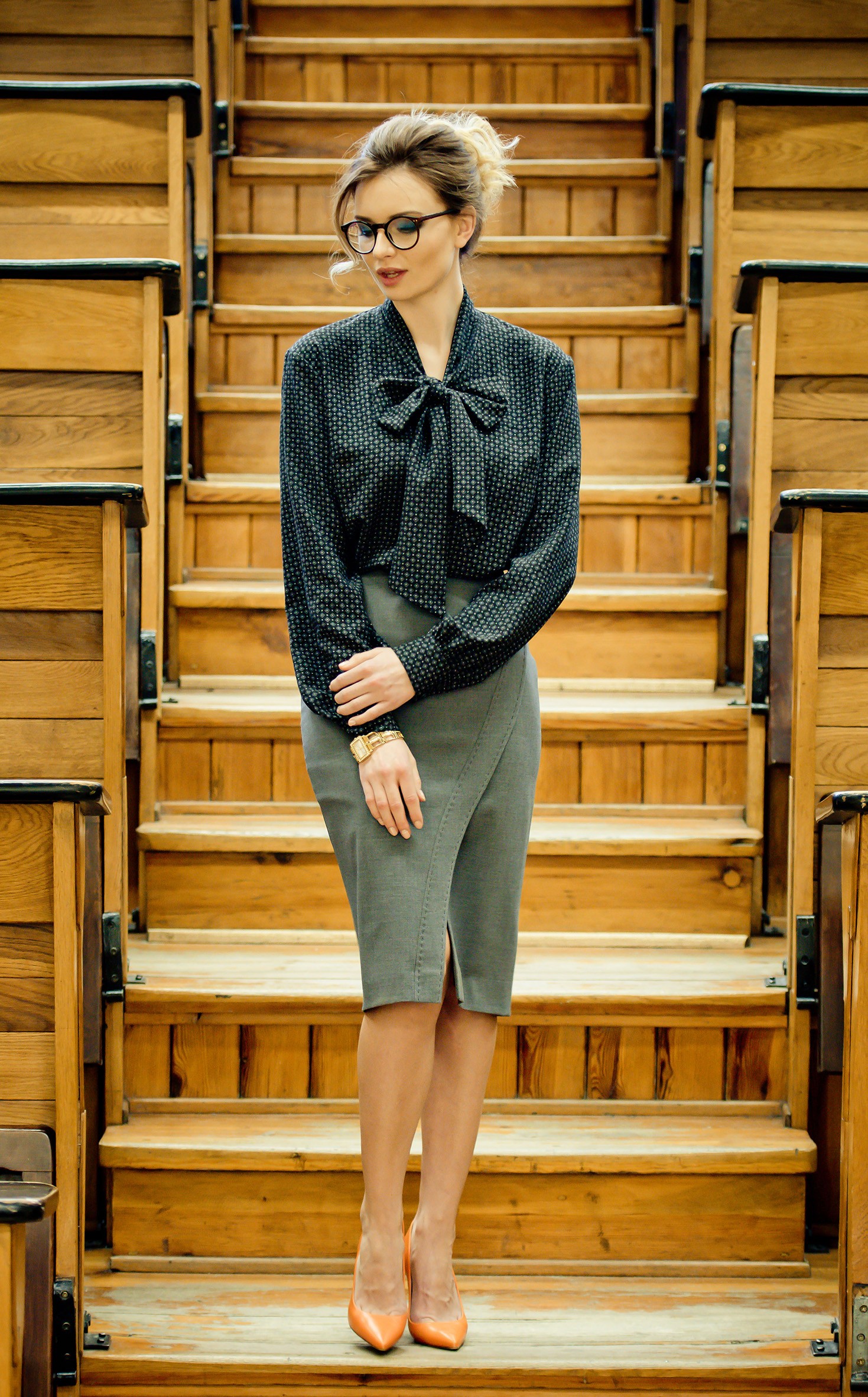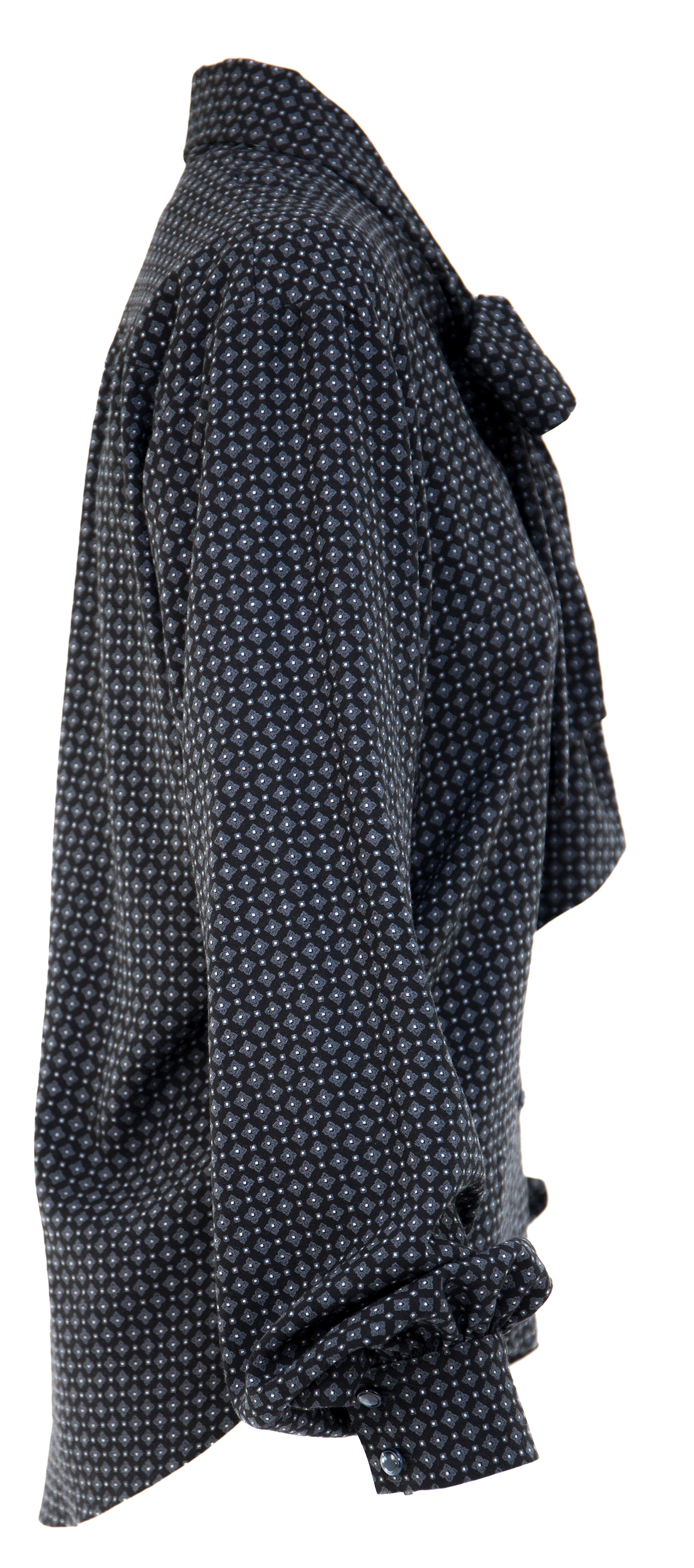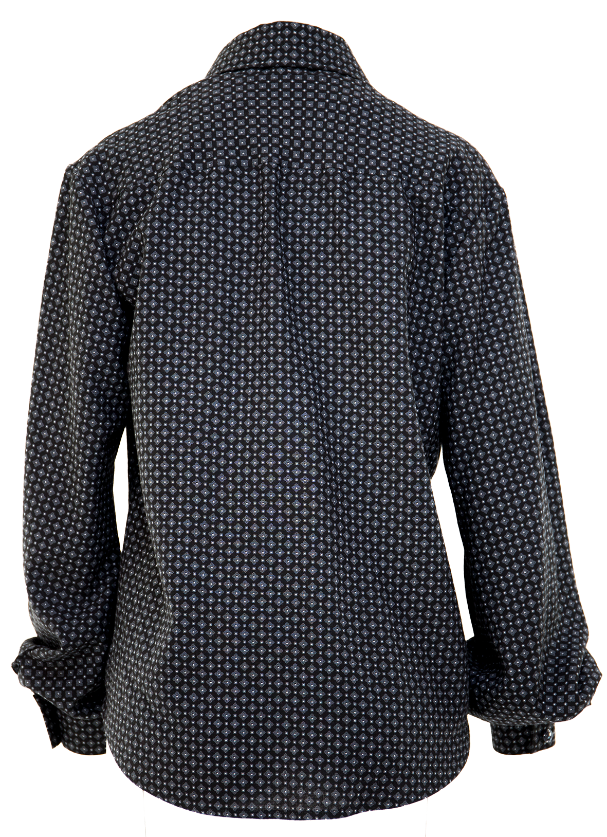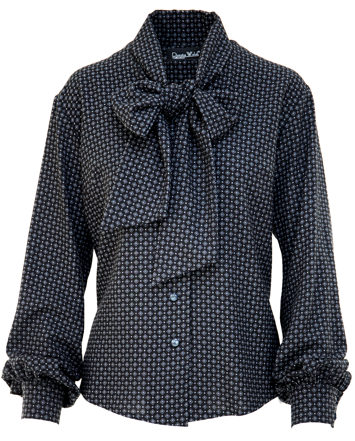 Koszulowa bluzka uszyta jest z włoskiej wiskozy w drobne wzory. Tradycyjny kołnierz zastąpiono szarfą zawiązywaną na kokardę lub swobodnie przewiązywaną. Zapina na guziki. Rękawy wykończone mankietami. Doskonale sprawdzi się w połączeniu z ołówkową spódnicą lub spodniami typu cygaretki.