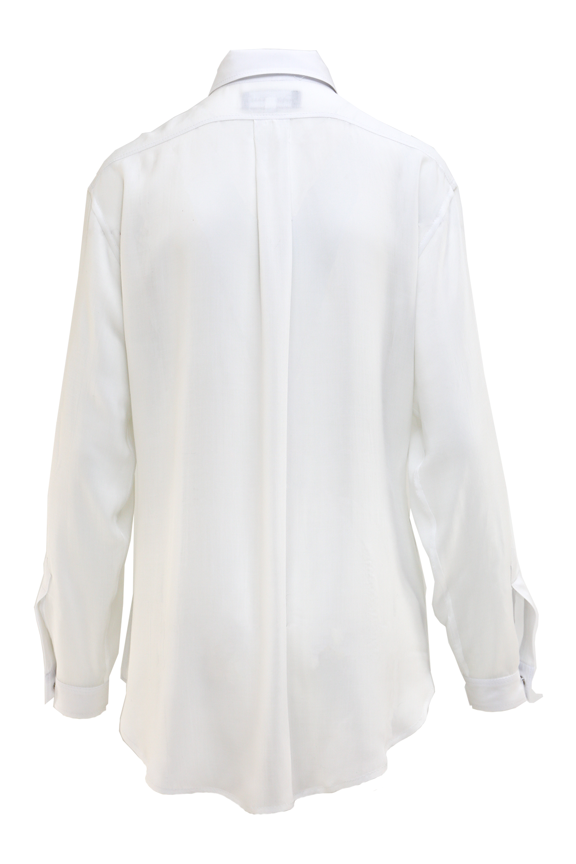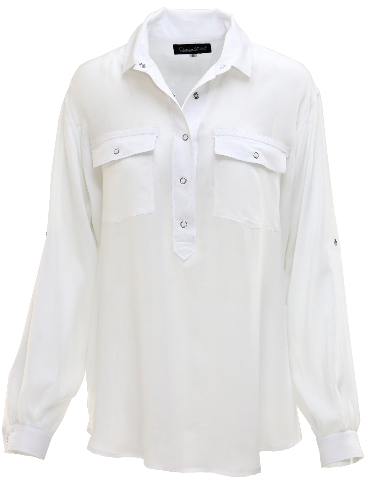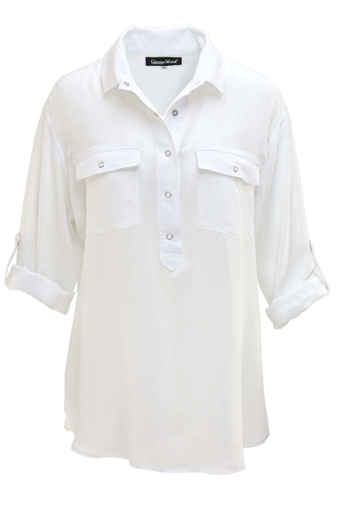 Delikatna koszula uszyta z miękkiej, lekkiej bawełny w kolorze śnieżnej bieli. Z przodu zapięcie typu polo oraz dwie kieszenie. Rękawy mogą być podwijane i zapinane na springi. Bardzo dobrze wygląda ze spodniami typu rurki lub eleganckimi nadając nieco casualowego stylu.