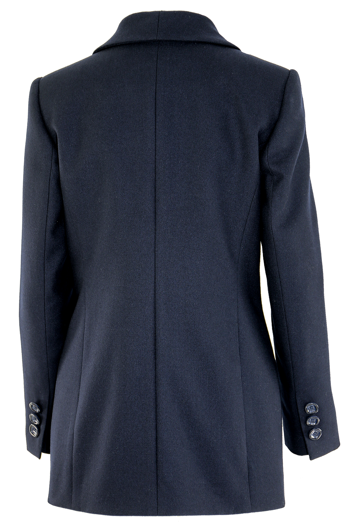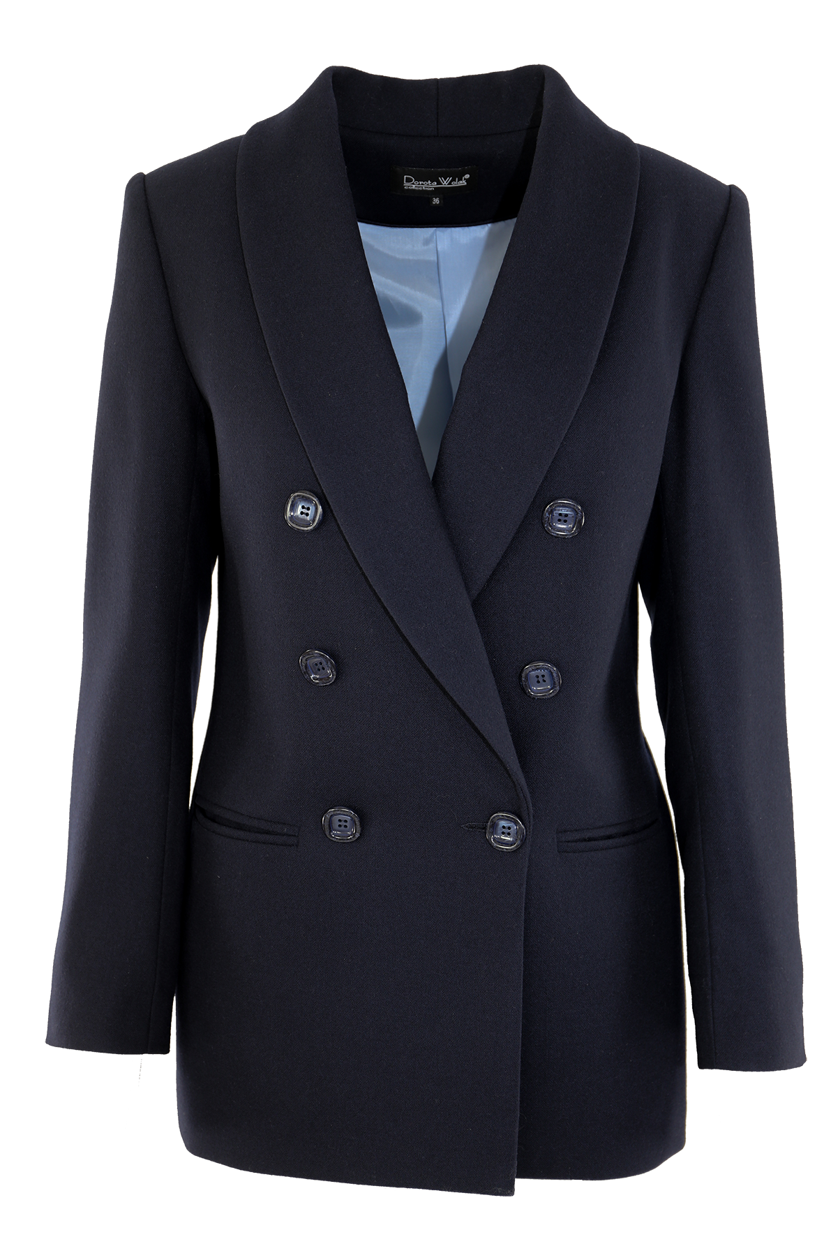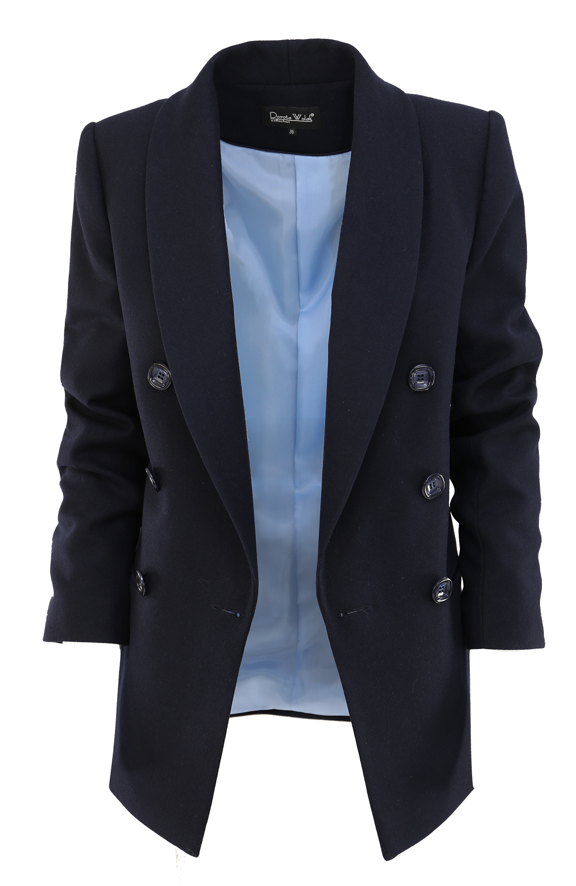 Marynarka o kroju oversize w kolorze ciemnego granatu. Zapięcie dwurzędowe z pięknym szalowym kołnierzem oraz kieszeniami na przodzie. Idealny wybór do stylizacji biurowych lub na co dzień do jeansów czy spódnic.