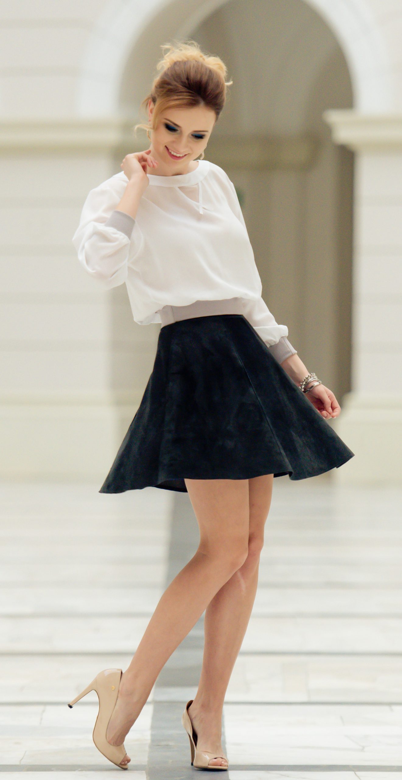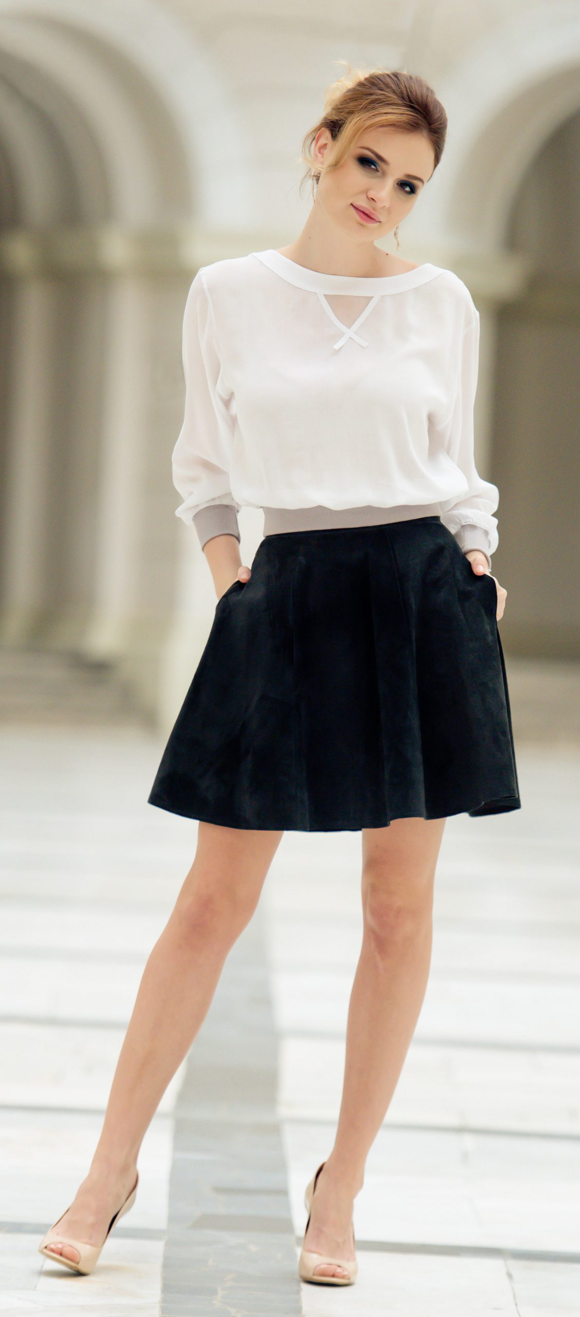 Śliczna spódnica krojona z 6 klinów tworzących połowę koła. Uszyta jest ze skóry naturalnej typu zamsz w kolorze czarnym. W szwach bocznych znajdują się kieszenie. Zapinana z tyłu na metalowy zamek. Talia podkreślona paskiem o szerokości 6 cm. Ozdobna podszewka o splocie żakardowym w kolorze fioletu. Wspaniała propozycja na różne okazje.