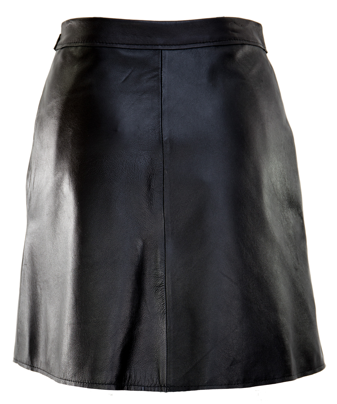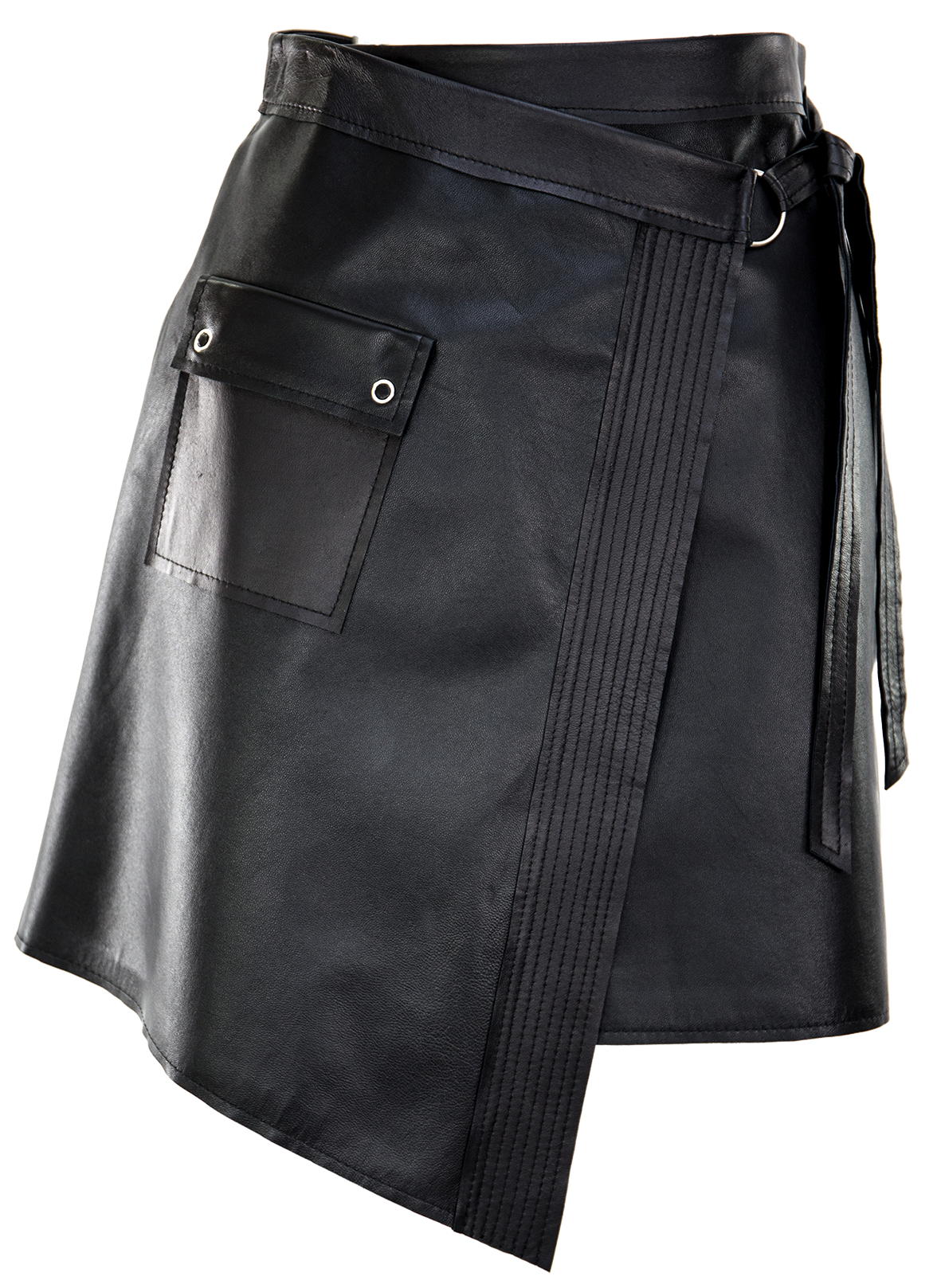 Krótka spódnica portfelowa, w stylu glam-rock. Lekko rozszerzana o asymetrycznym kształcie z przodu. Uszyta z czarnej skóry licowej na wiskozowej podszewce z naszytą ozdobną kieszonką, zapinana na springi. Doskonale sprawdzi się T-shirtem, luźną bluzką lub sweterkiem. Można wykorzystywać ją do różnych stylizacji przez cały rok.