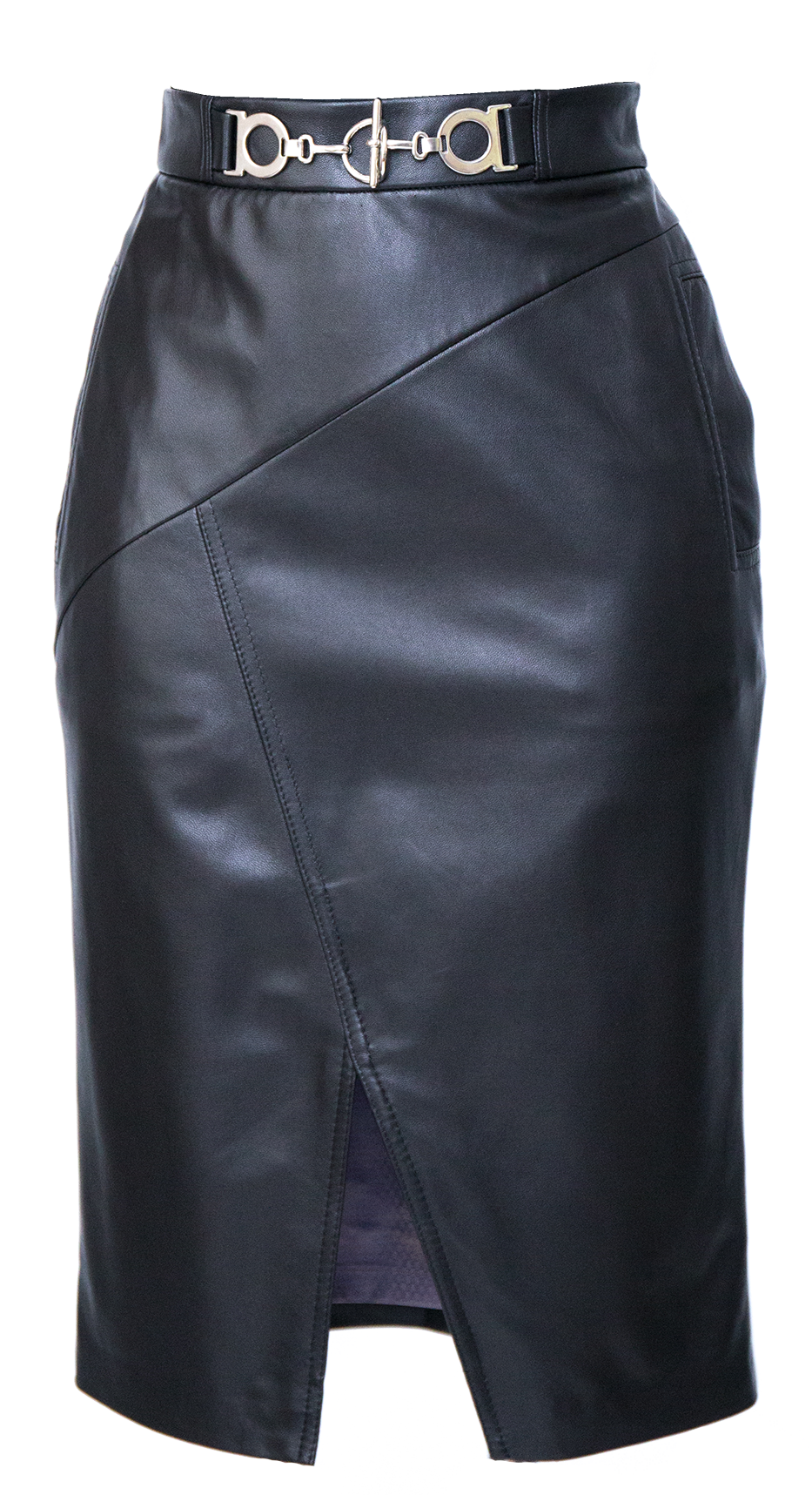 Spódnica uszyta jest ze skóry naturalnej w kolorze czarnym z wiskozową podszewką. Na bokach znajdują się kieszenie. Z tyłu zapinana jest na metalowy zamek. Talię podkreśla metalowa ozdoba naszyta na pasku. Z przodu znajduje się lekko asymetryczny rozporek.