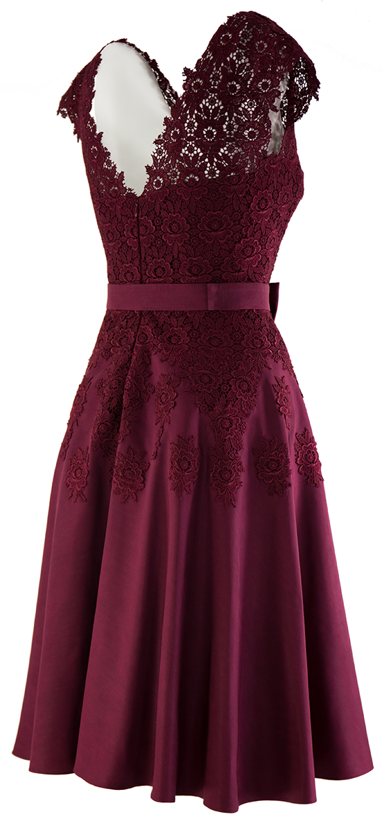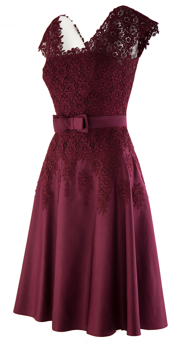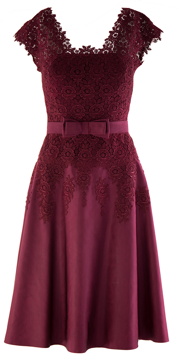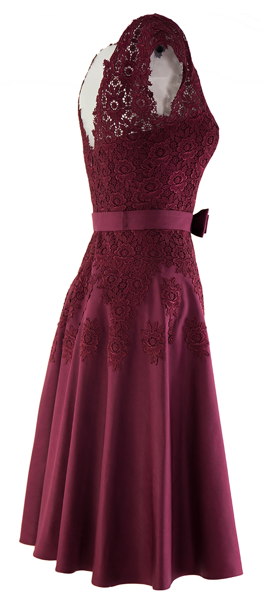 Elegancka sukienka w bordowym kolorze. Ozdobiona koronką naszytą na gorset. Świetnie podkreśla figurę. Odcinany dół doda ekstrawagancji każdej stylizacji.