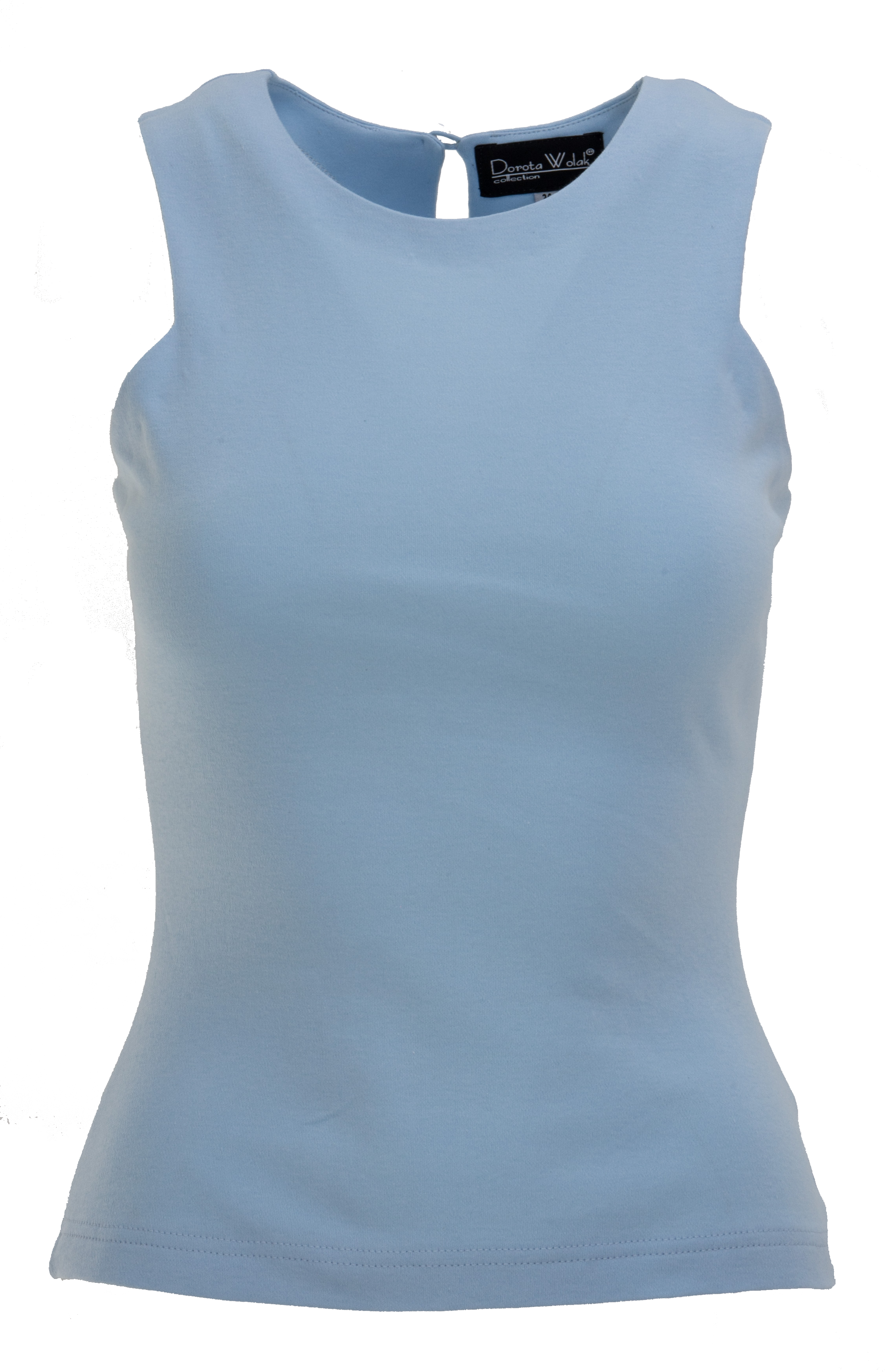Letni, prosty T-shirt z dzianiny bawełnianej w kolorze jasnoniebieskim. Z tyłu łezka zapinana na guziczek. Fantazyjny podkrój okolicy pach.