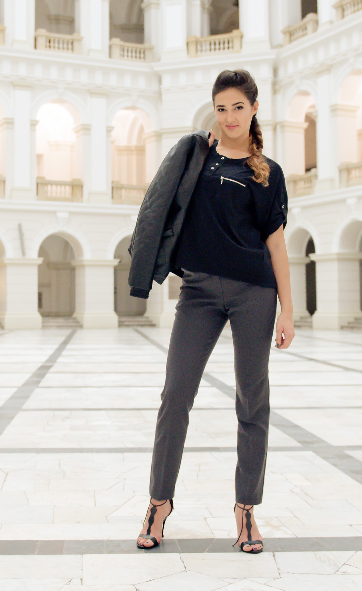 T-shirt typu oversize z czarnej bawełny organicznej. Zapięcie polo, rękawy podwijane. Na przodzie naszyta jest kieszonka zasuwana na zamek. Pięknie komponuje się zarówno w bardziej eleganckich stylizacjach, jak też jeansami czy szortami.